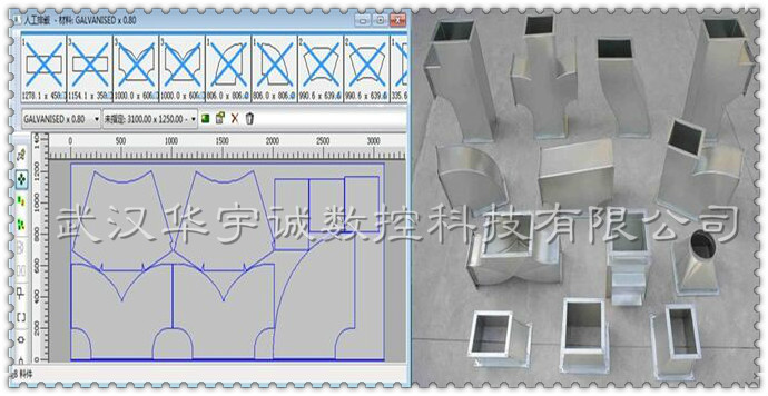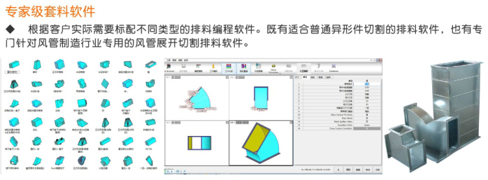 武漢華宇誠數(shù)控生產(chǎn)的通風(fēng)管道數(shù)控等離子切割機(jī),針對(duì)風(fēng)管展開切割進(jìn)行了專門優(yōu)化。切割速度更快、切割精度更高、切割效果更好。并搭配專門的風(fēng)管展開軟件,用戶只需選擇要切割的風(fēng)管類型,輸入相應(yīng)尺寸參數(shù),便可自動(dòng)排料、自動(dòng)生成加工程序,用戶直接用U盤在切割機(jī)上調(diào)入加工程序切割即可。